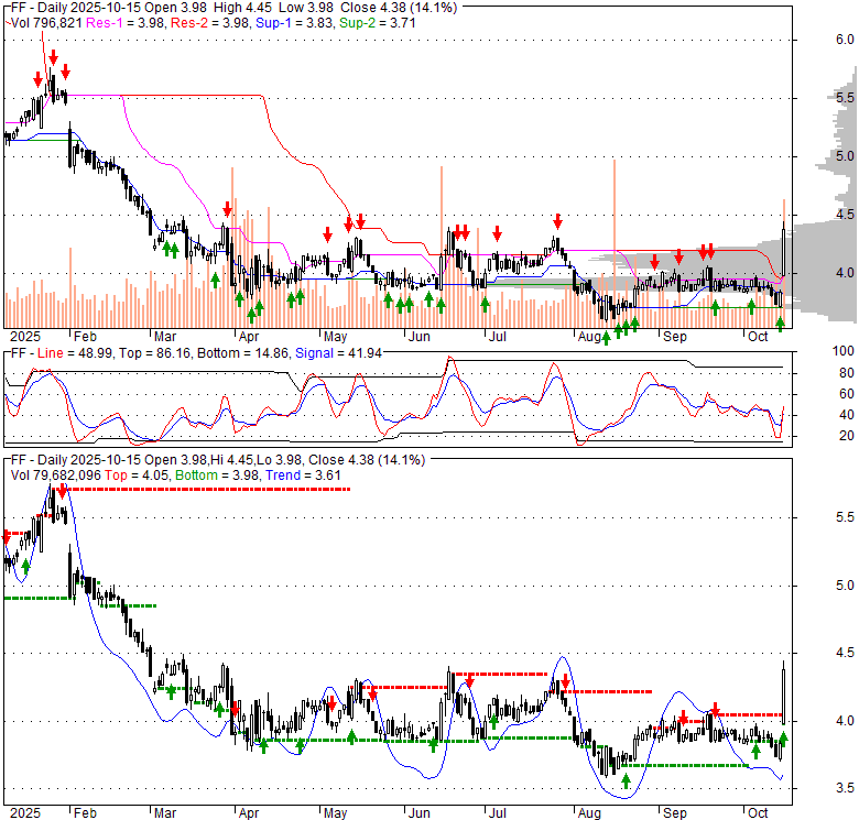 Price has closed above its short-term moving average. Short-term moving average is currently above mid-term; and below long-term moving average. From the relationship between price and moving averages: This stock is BULLISH in short-term; and NEUTRAL in mid-long term.[ FF ] has closed It is unclear right now based on current values. 42.2% wider than normal. The large width of the bands suggest high volatility as compared to its normal range. The bands have been in this wide range for 0 days. This is a sign that the current trend might continue.