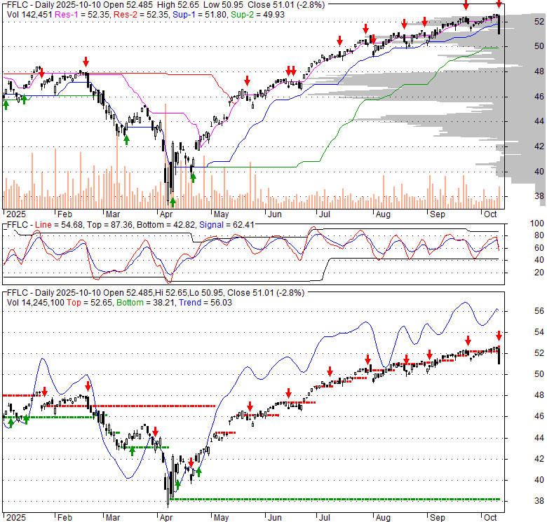 Price has closed below its short-term moving average. Short-term moving average is currently above mid-term; and above long-term moving average. From the relationship between price and moving averages: This stock is NEUTRAL in short-term; and BULLISH in mid-long term.[ FFLC ] has closed below the lower bollinger band by 17.1%. If price is in a downtrend band; this downward trend might continue. However a short term pullback inside the band is likely. Bollinger Bands are 17.3% narrower than normal. The current width of the bands does not suggest anything about the future direction or movement of prices.