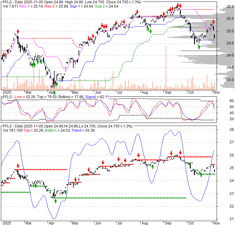 Price has closed below its short-term moving average. Short-term moving average is currently below mid-term; and below long-term moving average. From the relationship between price and moving averages: This stock is BEARISH in short-term; and BEARISH in mid-long term.[ FFLS ] has closed above bottom band by 21.6%. Bollinger Bands are 11.2% wider than normal. The current width of the bands does not suggest anything about the future direction or movement of prices.