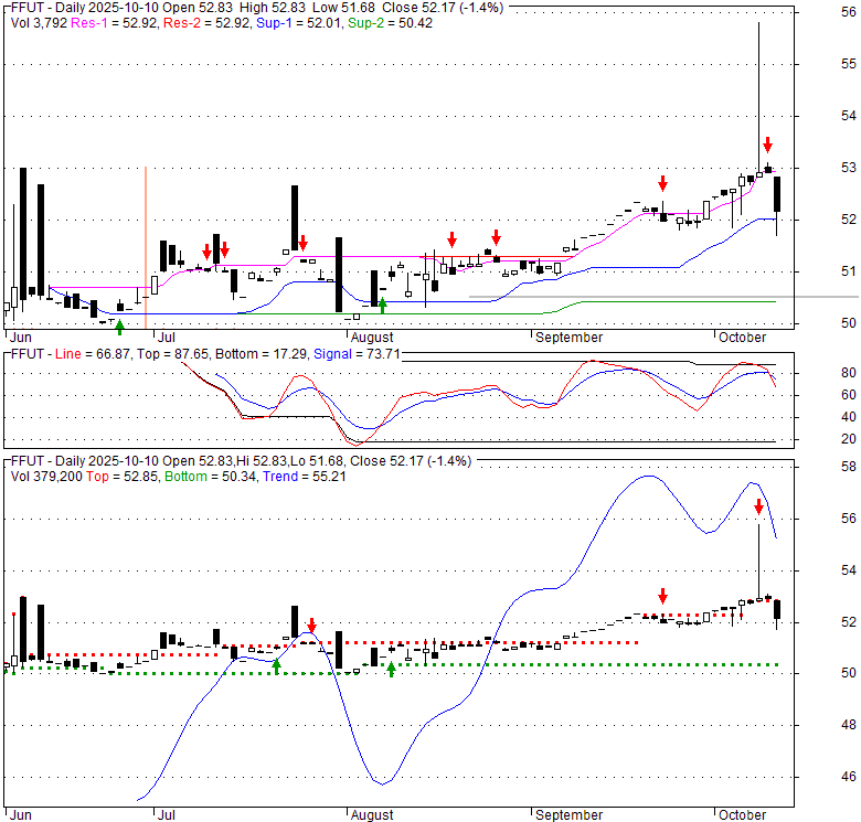 Price has closed below its short-term moving average. Short-term moving average is currently above mid-term; and below long-term moving average. From the relationship between price and moving averages: This stock is NEUTRAL in short-term; and NEUTRAL in mid-long term.[ FFUT ] has closed above bottom band by 46.1%. Bollinger Bands are 0% narrower than normal.
