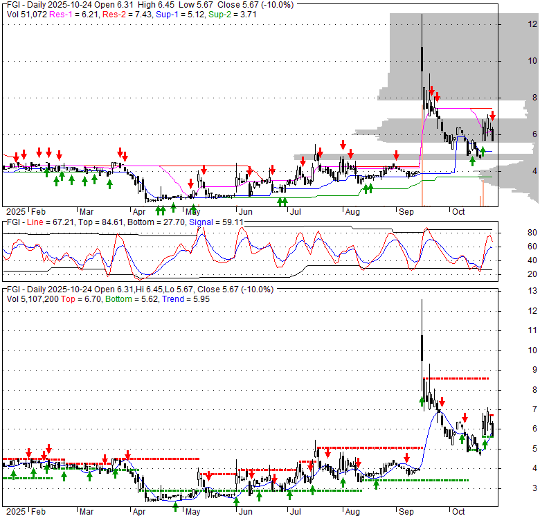 Price has closed below its short-term moving average. Short-term moving average is currently above mid-term; and above long-term moving average. From the relationship between price and moving averages: This stock is NEUTRAL in short-term; and BULLISH in mid-long term.[ FGI ] has closed below upper band by 32.3%. Bollinger Bands are 19.5% wider than normal. The current width of the bands does not suggest anything about the future direction or movement of prices.