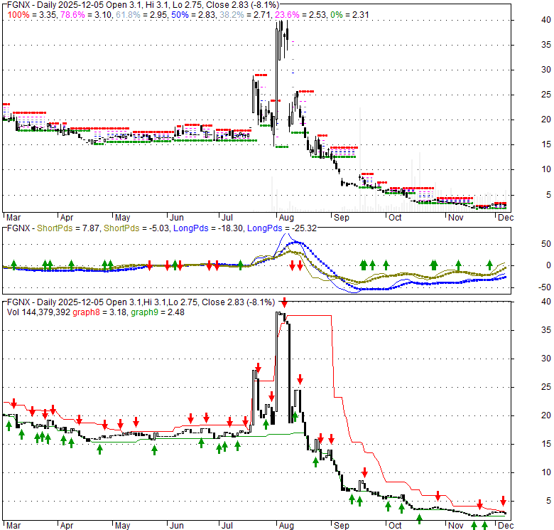 Price has closed below its short-term moving average. Short-term moving average is currently below mid-term; and below long-term moving average. From the relationship between price and moving averages: This stock is BEARISH in short-term; and BEARISH in mid-long term.[ FGNX ] has closed below upper band by 45.6%. Bollinger Bands are 89.5% narrower than normal. The narrow width of the bands suggests low volatility as compared to its normal range. The bands have been in this narrow range for 52 bars. This is a sign that the market may be about to initiate a new trend.
