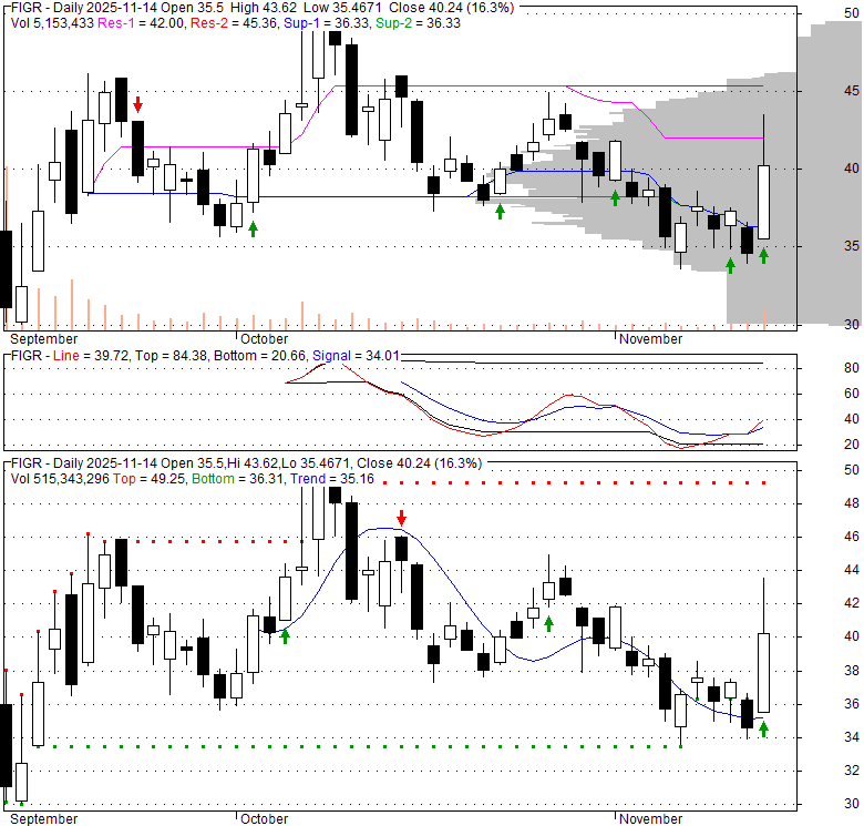 Price has closed above its short-term moving average. Short-term moving average is currently below mid-term; and below long-term moving average. From the relationship between price and moving averages: This stock is NEUTRAL in short-term; and NEUTRAL in mid-long term.[ FIGR ] has closed below upper band by 37.9%. Bollinger Bands are 0% narrower than normal.
