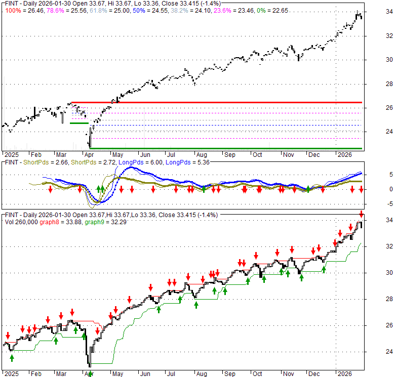 Price has closed below its short-term moving average. Short-term moving average is currently above mid-term; and above long-term moving average. From the relationship between price and moving averages: This stock is NEUTRAL in short-term; and BULLISH in mid-long term.[ FINT ] has closed below upper band by 33.0%. Bollinger Bands are 45.3% wider than normal. The large width of the bands suggest high volatility as compared to its normal range. The bands have been in this wide range for 2 days. This is a sign that the current trend might continue.
