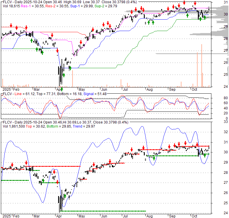 Price has closed above its short-term moving average. Short-term moving average is currently below mid-term; and above long-term moving average. From the relationship between price and moving averages: This stock is NEUTRAL in short-term; and NEUTRAL in mid-long term.[ FLCV ] has closed below upper band by 43.9%. Bollinger Bands are 31.2% wider than normal. The current width of the bands does not suggest anything about the future direction or movement of prices.