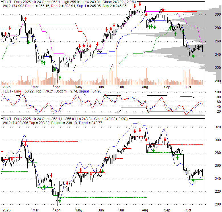 Price has closed below its short-term moving average. Short-term moving average is currently below mid-term; and below long-term moving average. From the relationship between price and moving averages: This stock is BEARISH in short-term; and BEARISH in mid-long term.[ FLUT ] has closed above bottom band by 23.5%. Bollinger Bands are 50.5% narrower than normal. The narrow width of the bands suggests low volatility as compared to its normal range. The bands have been in this narrow range for 4 bars. This is a sign that the market may be about to initiate a new trend.