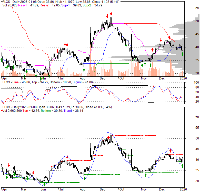 Price has closed above its short-term moving average. Short-term moving average is currently above mid-term; and below long-term moving average. From the relationship between price and moving averages: This stock is BULLISH in short-term; and NEUTRAL in mid-long term.[ FLXS ] has closed below upper band by 24.4%. Bollinger Bands are 63% narrower than normal. The narrow width of the bands suggests low volatility as compared to its normal range. The bands have been in this narrow range for 15 bars. This is a sign that the market may be about to initiate a new trend.