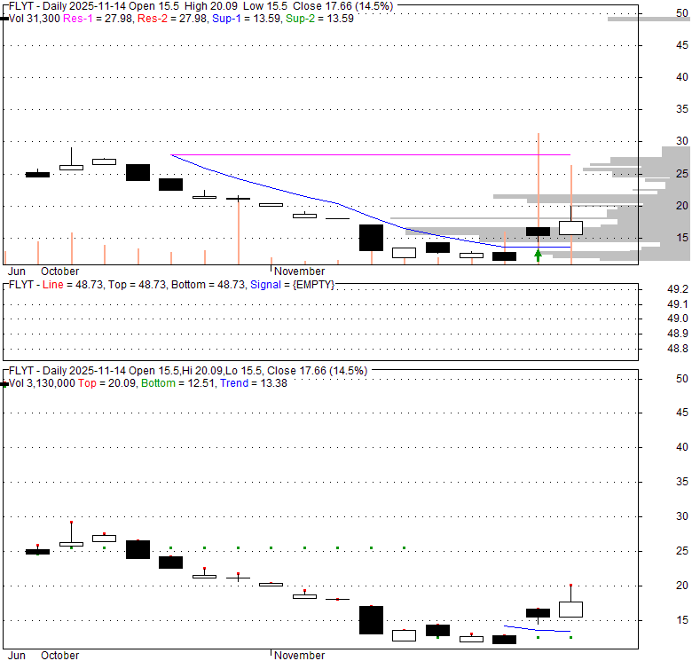 Price has closed above its short-term moving average. Short-term moving average is currently below mid-term; and below long-term moving average. From the relationship between price and moving averages: This stock is NEUTRAL in short-term; and NEUTRAL in mid-long term.[ FLYT ] has closed above bottom band by 48.1%. Bollinger Bands are 0% narrower than normal.