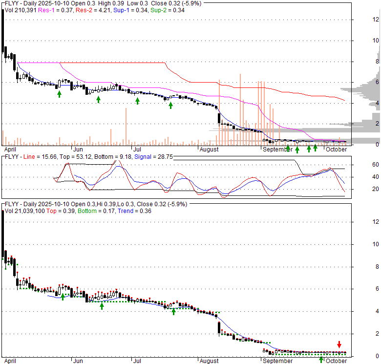 Price has closed below its short-term moving average. Short-term moving average is currently below mid-term; and below long-term moving average. From the relationship between price and moving averages: This stock is BEARISH in short-term; and BEARISH in mid-long term.[ FLYY ] has closed below the lower bollinger band by 6.6%. Bollinger Bands are 0% narrower than normal.