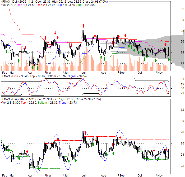 Price has closed above its short-term moving average. Short-term moving average is currently below mid-term; and below long-term moving average. From the relationship between price and moving averages: This stock is NEUTRAL in short-term; and BEARISH in mid-long term.[ FMAO ] has closed below upper band by 13.9%. Bollinger Bands are 16.5% narrower than normal. The current width of the bands does not suggest anything about the future direction or movement of prices.