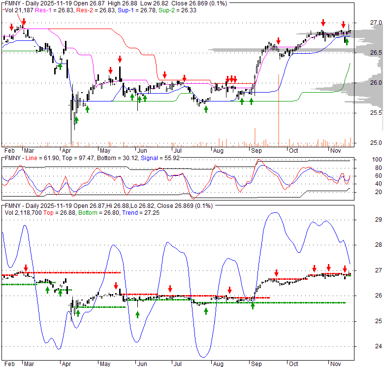 Price has closed above its short-term moving average. Short-term moving average is currently above mid-term; and above long-term moving average. From the relationship between price and moving averages: This stock is BULLISH in short-term; and BULLISH in mid-long term.[ FMNY ] has closed below upper band by 16.0%. Bollinger Bands are 49.4% narrower than normal. The narrow width of the bands suggests low volatility as compared to its normal range. The bands have been in this narrow range for 12 bars. This is a sign that the market may be about to initiate a new trend.