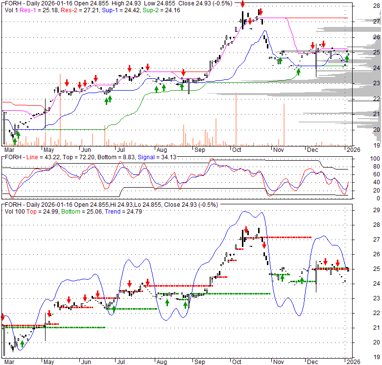 Price has closed above its short-term moving average. Short-term moving average is currently below mid-term; and below long-term moving average. From the relationship between price and moving averages: This stock is NEUTRAL in short-term; and BEARISH in mid-long term.[ FORH ] has closed below upper band by 44.0%. Bollinger Bands are 27.3% narrower than normal. The current width of the bands does not suggest anything about the future direction or movement of prices.