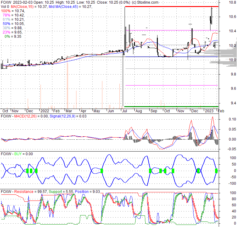 Price has closed below its short-term moving average. Short-term moving average is currently below mid-term; and above long-term moving average. From the relationship between price and moving averages: This stock is NEUTRAL in short-term; and NEUTRAL in mid-long term.[ FOXW ] has closed above bottom band by 34.3%. Bollinger Bands are 151.2% wider than normal. The large width of the bands suggest high volatility as compared to its normal range. The bands have been in this wide range for 12 days. This is a sign that the current trend might continue.