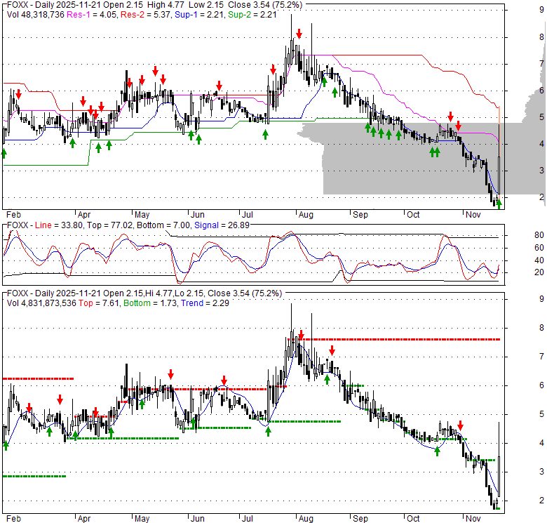 Price has closed above its short-term moving average. Short-term moving average is currently below mid-term; and below long-term moving average. From the relationship between price and moving averages: This stock is NEUTRAL in short-term; and BEARISH in mid-long term.[ FOXX ] has closed below upper band by 28.4%. Bollinger Bands are 64.1% wider than normal. The large width of the bands suggest high volatility as compared to its normal range. The bands have been in this wide range for 4 days. This is a sign that the current trend might continue.
