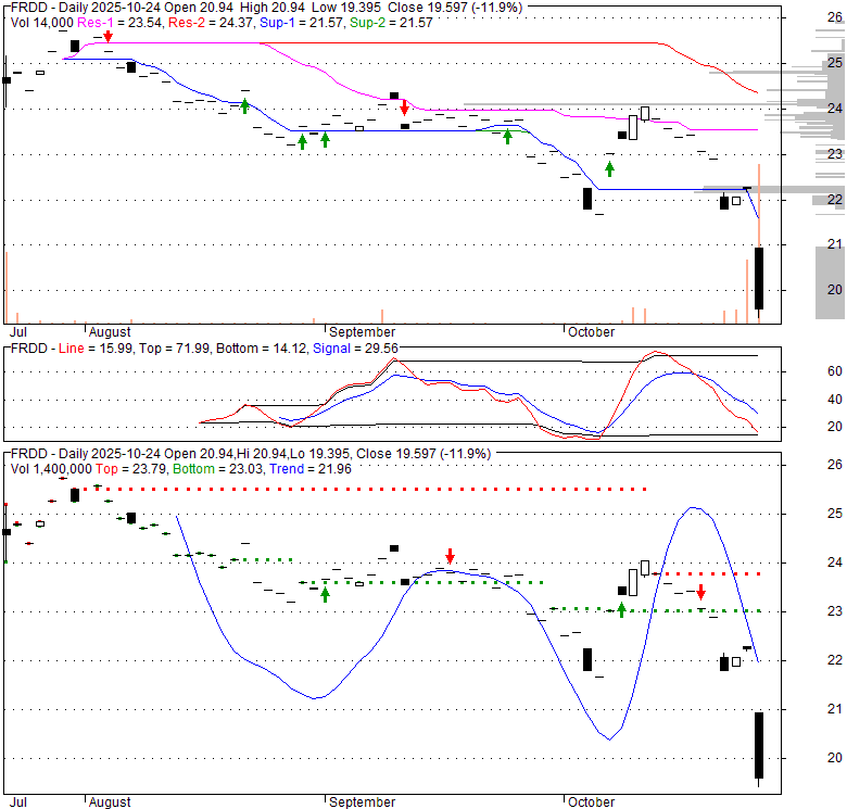 Price has closed below its short-term moving average. Short-term moving average is currently below mid-term; and below long-term moving average. From the relationship between price and moving averages: This stock is BEARISH in short-term; and NEUTRAL in mid-long term.[ FRDD ] has closed below the lower bollinger band by 21.1%. If price is in a downtrend band; this downward trend might continue. However a short term pullback inside the band is likely. Bollinger Bands are 0% narrower than normal.