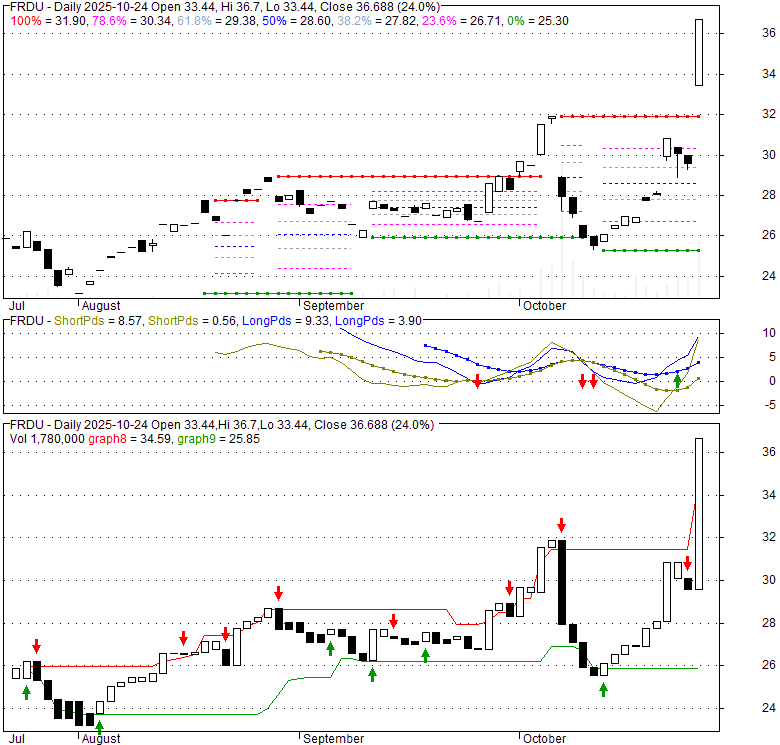 Price has closed above its short-term moving average. Short-term moving average is currently above mid-term; and below long-term moving average. From the relationship between price and moving averages: This stock is BULLISH in short-term; and NEUTRAL in mid-long term.[ FRDU ] has closed Bollinger Bands are 0% narrower than normal.