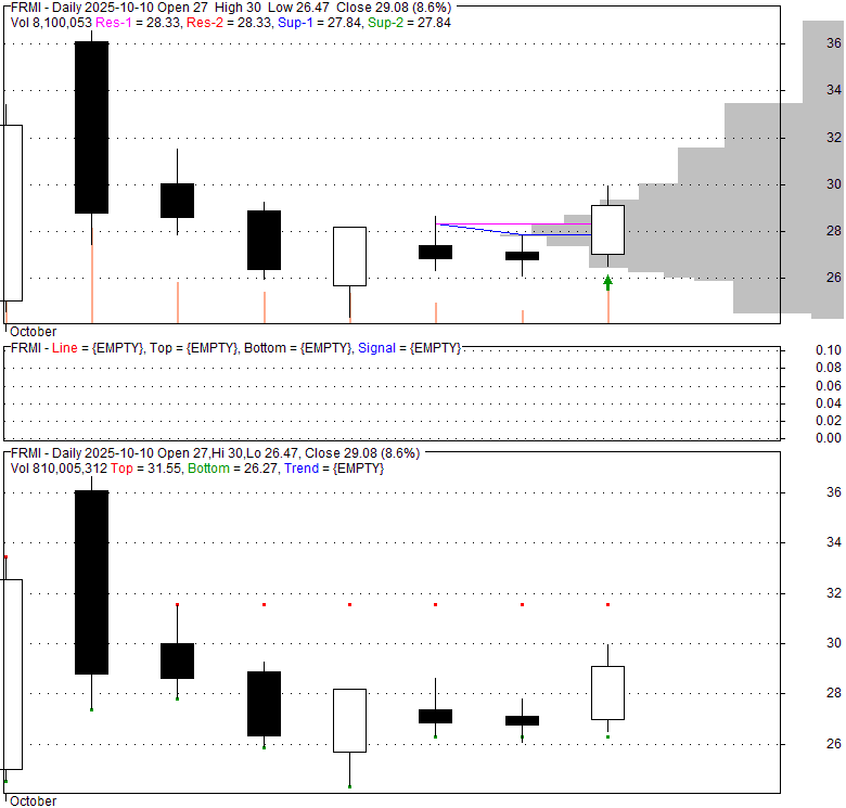 Price has closed above its short-term moving average. Short-term moving average is currently below mid-term; and below long-term moving average. From the relationship between price and moving averages: This stock is NEUTRAL in short-term; and NEUTRAL in mid-long term.[ FRMI ] has closed Bollinger Bands are 0% narrower than normal.