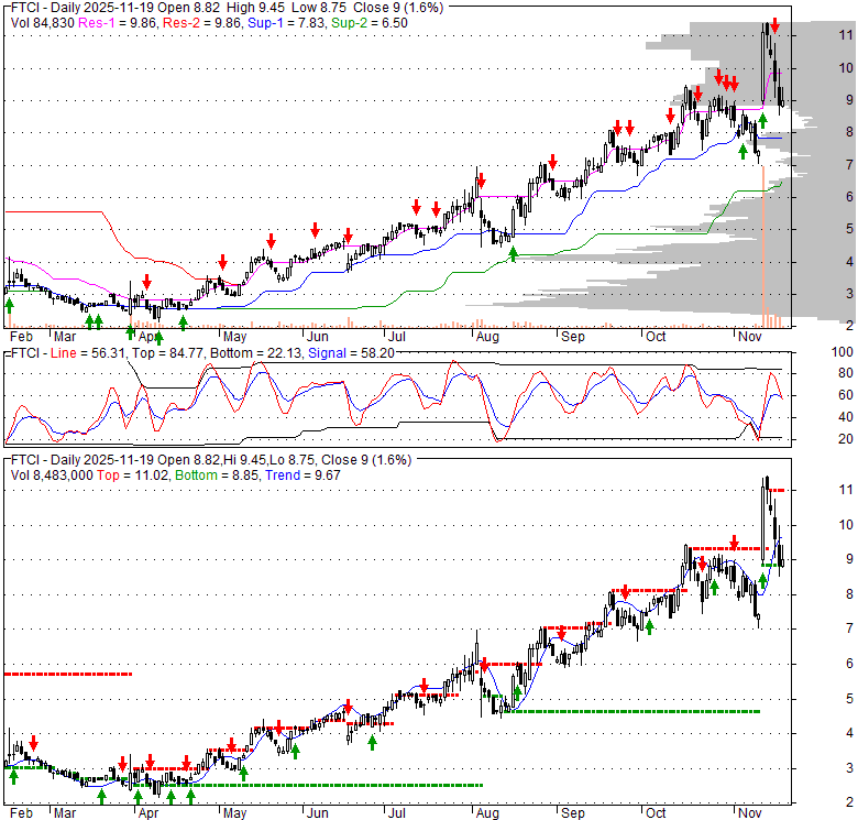 Price has closed below its short-term moving average. Short-term moving average is currently above mid-term; and above long-term moving average. From the relationship between price and moving averages: This stock is NEUTRAL in short-term; and BULLISH in mid-long term.[ FTCI ] has closed below upper band by 47.7%. Bollinger Bands are 143% wider than normal. The large width of the bands suggest high volatility as compared to its normal range. The bands have been in this wide range for 5 days. This is a sign that the current trend might continue.