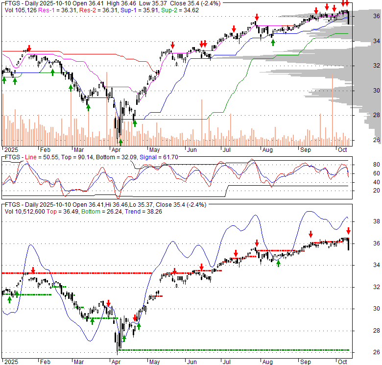 Price has closed below its short-term moving average. Short-term moving average is currently above mid-term; and above long-term moving average. From the relationship between price and moving averages: This stock is NEUTRAL in short-term; and BULLISH in mid-long term.[ FTGS ] has closed below the lower bollinger band by 7.3%. If price is in a downtrend band; this downward trend might continue. However a short term pullback inside the band is likely. Bollinger Bands are 28.1% narrower than normal. The current width of the bands does not suggest anything about the future direction or movement of prices.