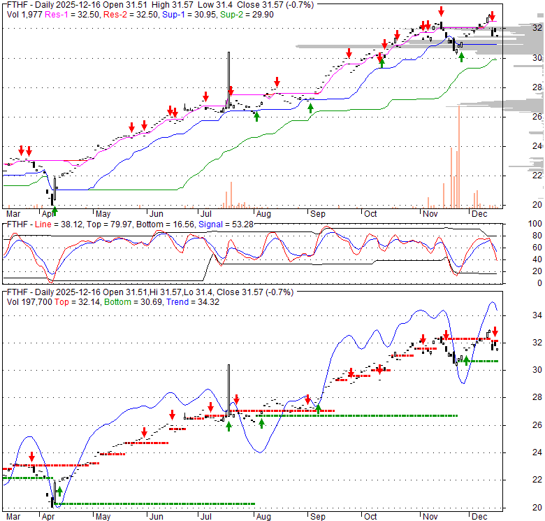 Price has closed below its short-term moving average. Short-term moving average is currently above mid-term; and above long-term moving average. From the relationship between price and moving averages: This stock is NEUTRAL in short-term; and BULLISH in mid-long term.[ FTHF ] has closed above bottom band by 31.2%. Bollinger Bands are 8.9% narrower than normal. The current width of the bands does not suggest anything about the future direction or movement of prices.