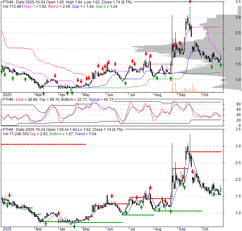 Price has closed above its short-term moving average. Short-term moving average is currently below mid-term; and above long-term moving average. From the relationship between price and moving averages: This stock is NEUTRAL in short-term; and NEUTRAL in mid-long term.[ FTHM ] has closed below upper band by 27.6%. Bollinger Bands are 64.9% narrower than normal. The narrow width of the bands suggests low volatility as compared to its normal range. The bands have been in this narrow range for 6 bars. This is a sign that the market may be about to initiate a new trend.