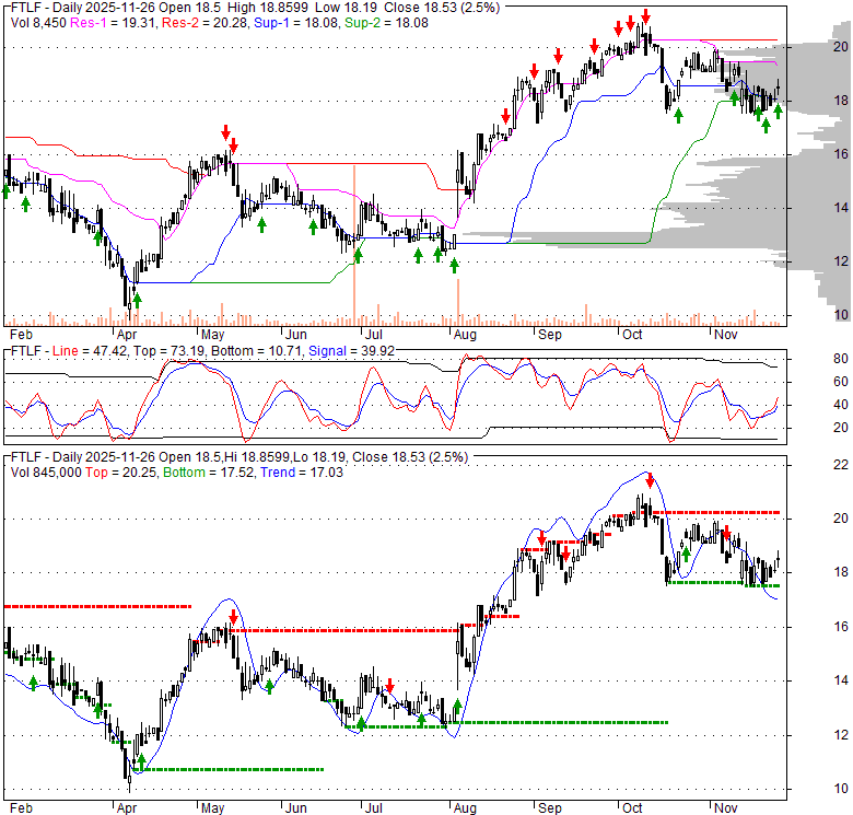 Price has closed above its short-term moving average. Short-term moving average is currently below mid-term; and above long-term moving average. From the relationship between price and moving averages: This stock is NEUTRAL in short-term; and NEUTRAL in mid-long term.[ FTLF ] has closed below upper band by 38.0%. Bollinger Bands are 36.6% narrower than normal. The current width of the bands does not suggest anything about the future direction or movement of prices.
