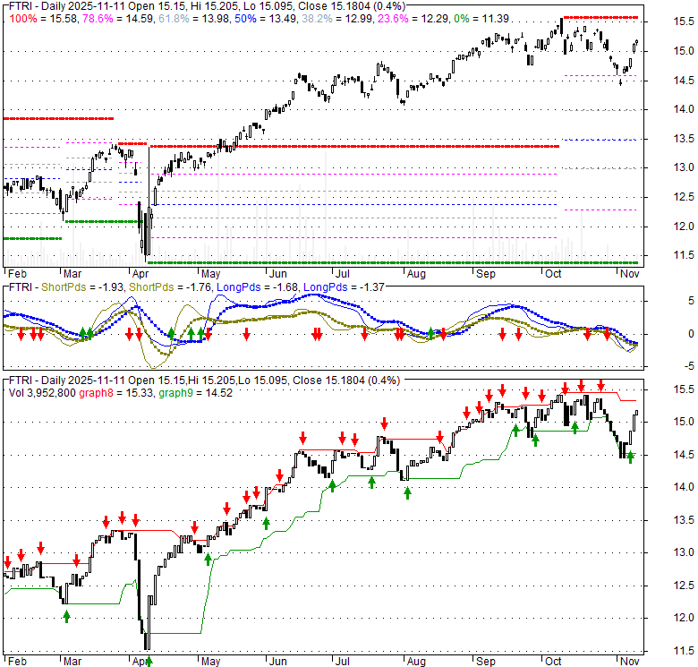 Price has closed above its short-term moving average. Short-term moving average is currently below mid-term; and above long-term moving average. From the relationship between price and moving averages: This stock is NEUTRAL in short-term; and NEUTRAL in mid-long term.[ FTRI ] has closed below upper band by 29.3%. Bollinger Bands are 57.4% wider than normal. The large width of the bands suggest high volatility as compared to its normal range. The bands have been in this wide range for 5 days. This is a sign that the current trend might continue.