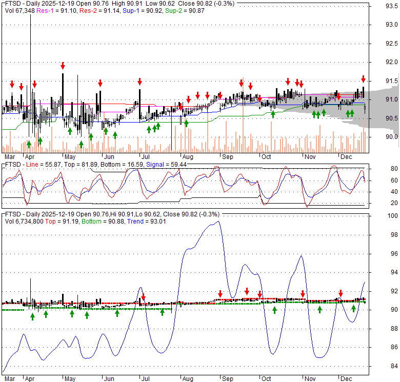 Price has closed below its short-term moving average. Short-term moving average is currently above mid-term; and above long-term moving average. From the relationship between price and moving averages: This stock is NEUTRAL in short-term; and BULLISH in mid-long term.[ FTSD ] has closed above bottom band by 12.9%. Bollinger Bands are 0.8% wider than normal. The current width of the bands does not suggest anything about the future direction or movement of prices.