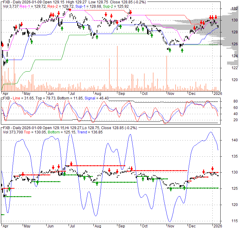 Price has closed below its short-term moving average. Short-term moving average is currently above mid-term; and above long-term moving average. From the relationship between price and moving averages: This stock is NEUTRAL in short-term; and NEUTRAL in mid-long term.[ FXB ] has closed above bottom band by 15.3%. Bollinger Bands are 30.9% narrower than normal. The current width of the bands does not suggest anything about the future direction or movement of prices.