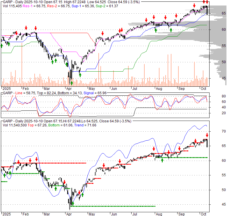 Price has closed below its short-term moving average. Short-term moving average is currently above mid-term; and above long-term moving average. From the relationship between price and moving averages: This stock is NEUTRAL in short-term; and BULLISH in mid-long term.[ GARP ] has closed below the lower bollinger band by 0.0%. Although price has broken the lower band and a downside breakout is possible; the most likely direction for [ GARP ] is to continue within current trading range. Bollinger Bands are 6% narrower than normal. The current width of the bands does not suggest anything about the future direction or movement of prices.
