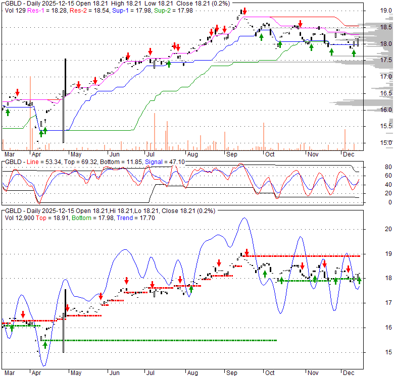 Price has closed above its short-term moving average. Short-term moving average is currently below mid-term; and below long-term moving average. From the relationship between price and moving averages: This stock is NEUTRAL in short-term; and BEARISH in mid-long term.[ GBLD ] has closed below upper band by 43.4%. Bollinger Bands are 12.2% narrower than normal. The current width of the bands does not suggest anything about the future direction or movement of prices.