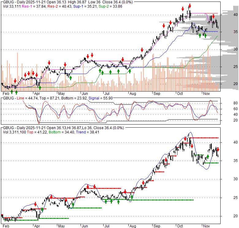 Price has closed below its short-term moving average. Short-term moving average is currently below mid-term; and above long-term moving average. From the relationship between price and moving averages: This stock is BEARISH in short-term; and NEUTRAL in mid-long term.[ GBUG ] has closed above bottom band by 41.3%. Bollinger Bands are 16.1% wider than normal. The current width of the bands does not suggest anything about the future direction or movement of prices.