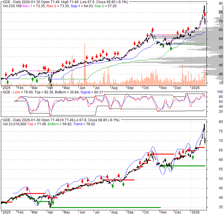 Price has closed below its short-term moving average. Short-term moving average is currently above mid-term; and above long-term moving average. From the relationship between price and moving averages: This stock is NEUTRAL in short-term; and BULLISH in mid-long term.[ GDE ] has closed above bottom band by 49.1%. Bollinger Bands are 130.3% wider than normal. The large width of the bands suggest high volatility as compared to its normal range. The bands have been in this wide range for 6 days. This is a sign that the current trend might continue.