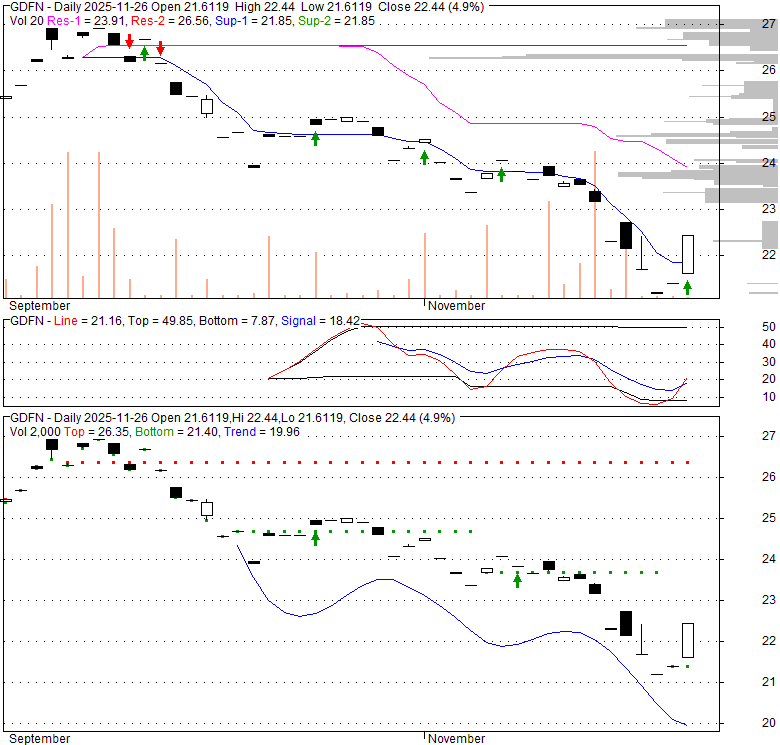 Price has closed above its short-term moving average. Short-term moving average is currently below mid-term; and below long-term moving average. From the relationship between price and moving averages: This stock is NEUTRAL in short-term; and NEUTRAL in mid-long term.[ GDFN ] has closed above bottom band by 37.0%. Bollinger Bands are 0% narrower than normal.