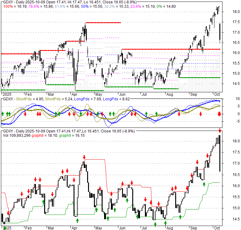 Price has closed below its short-term moving average. Short-term moving average is currently above mid-term; and above long-term moving average. From the relationship between price and moving averages: This stock is NEUTRAL in short-term; and BULLISH in mid-long term.[ GDXY ] has closed above bottom band by 4.2%. Bollinger Bands are 45.1% wider than normal. The large width of the bands suggest high volatility as compared to its normal range. The bands have been in this wide range for 6 days. This is a sign that the current trend might continue.