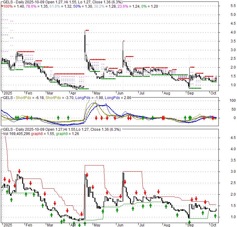 Price has closed above its short-term moving average. Short-term moving average is currently below mid-term; and below long-term moving average. From the relationship between price and moving averages: This stock is NEUTRAL in short-term; and BEARISH in mid-long term.[ GELS ] has closed below upper band by 42.9%. Bollinger Bands are 60.3% narrower than normal. The narrow width of the bands suggests low volatility as compared to its normal range. The bands have been in this narrow range for 10 bars. This is a sign that the market may be about to initiate a new trend.