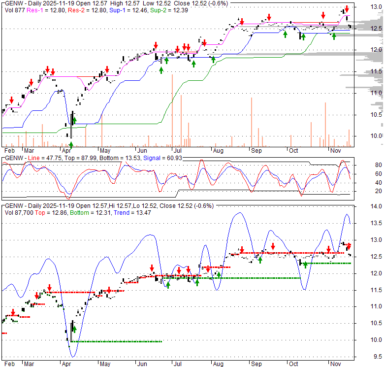 Price has closed below its short-term moving average. Short-term moving average is currently above mid-term; and above long-term moving average. From the relationship between price and moving averages: This stock is NEUTRAL in short-term; and BULLISH in mid-long term.[ GENW ] has closed above bottom band by 35.1%. Bollinger Bands are 41.7% wider than normal. The large width of the bands suggest high volatility as compared to its normal range. The bands have been in this wide range for 3 days. This is a sign that the current trend might continue.