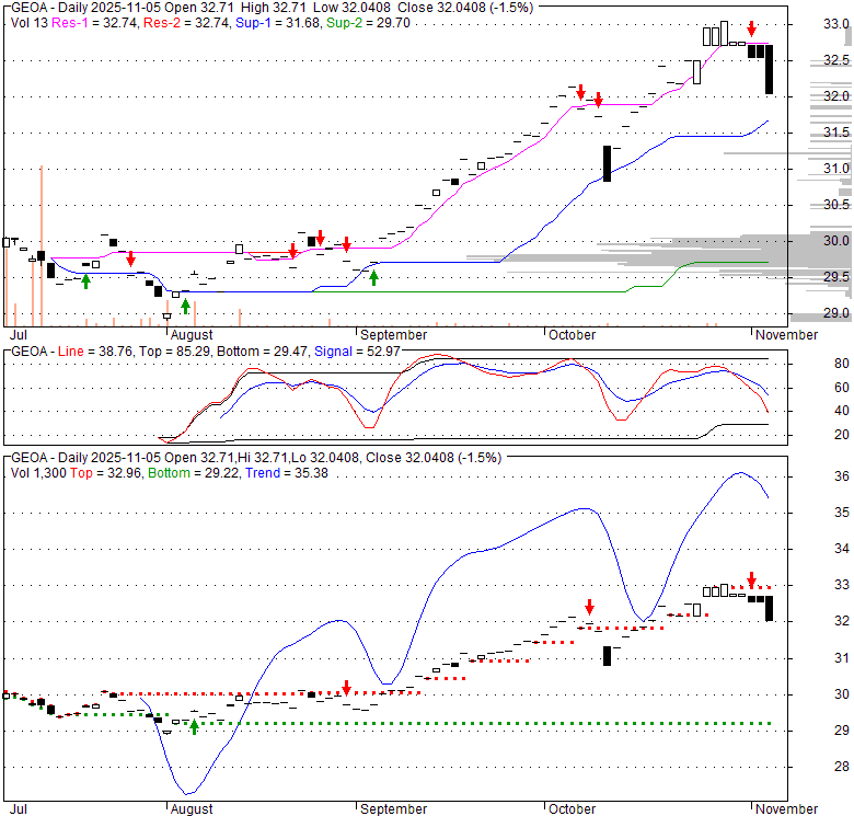 Price has closed below its short-term moving average. Short-term moving average is currently above mid-term; and below long-term moving average. From the relationship between price and moving averages: This stock is NEUTRAL in short-term; and NEUTRAL in mid-long term.[ GEOA ] has closed above bottom band by 18.5%. Bollinger Bands are 0% narrower than normal.