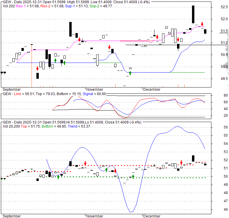 Price has closed below its short-term moving average. Short-term moving average is currently above mid-term; and below long-term moving average. From the relationship between price and moving averages: This stock is NEUTRAL in short-term; and NEUTRAL in mid-long term.[ GEW ] has closed above bottom band by 40.4%. Bollinger Bands are 0% narrower than normal.