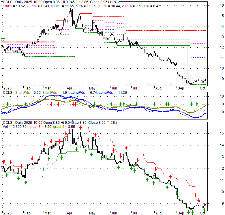 Price has closed above its short-term moving average. Short-term moving average is currently below mid-term; and below long-term moving average. From the relationship between price and moving averages: This stock is NEUTRAL in short-term; and BEARISH in mid-long term.[ GGLS ] has closed below upper band by 7.6%. Bollinger Bands are 61.1% narrower than normal. The narrow width of the bands suggests low volatility as compared to its normal range. The bands have been in this narrow range for 8 bars. This is a sign that the market may be about to initiate a new trend.