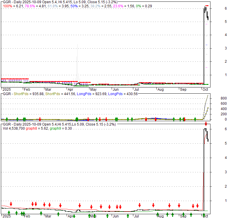 Price has closed below its short-term moving average. Short-term moving average is currently above mid-term; and above long-term moving average. From the relationship between price and moving averages: This stock is NEUTRAL in short-term; and BULLISH in mid-long term.[ GGR ] has closed below upper band by 19.9%. Bollinger Bands are 1968.6% wider than normal. The large width of the bands suggest high volatility as compared to its normal range. The bands have been in this wide range for 4 days. This is a sign that the current trend might continue.