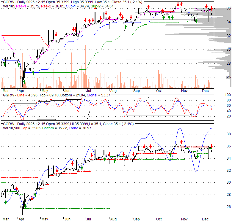 Price has closed below its short-term moving average. Short-term moving average is currently above mid-term; and above long-term moving average. From the relationship between price and moving averages: This stock is NEUTRAL in short-term; and BULLISH in mid-long term.[ GGRW ] has closed above bottom band by 0.8%. Bollinger Bands are 26.1% narrower than normal. The current width of the bands does not suggest anything about the future direction or movement of prices.