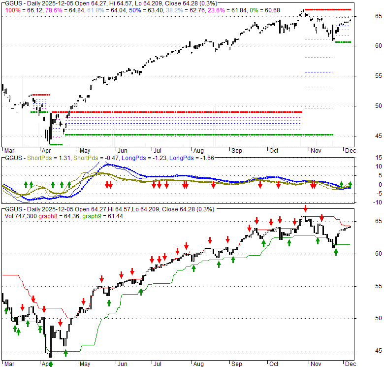 Price has closed above its short-term moving average. Short-term moving average is currently above mid-term; and above long-term moving average. From the relationship between price and moving averages: This stock is BULLISH in short-term; and BULLISH in mid-long term.[ GGUS ] has closed below upper band by 18.6%. Bollinger Bands are 44.2% wider than normal. The large width of the bands suggest high volatility as compared to its normal range. The bands have been in this wide range for 0 days. This is a sign that the current trend might continue.