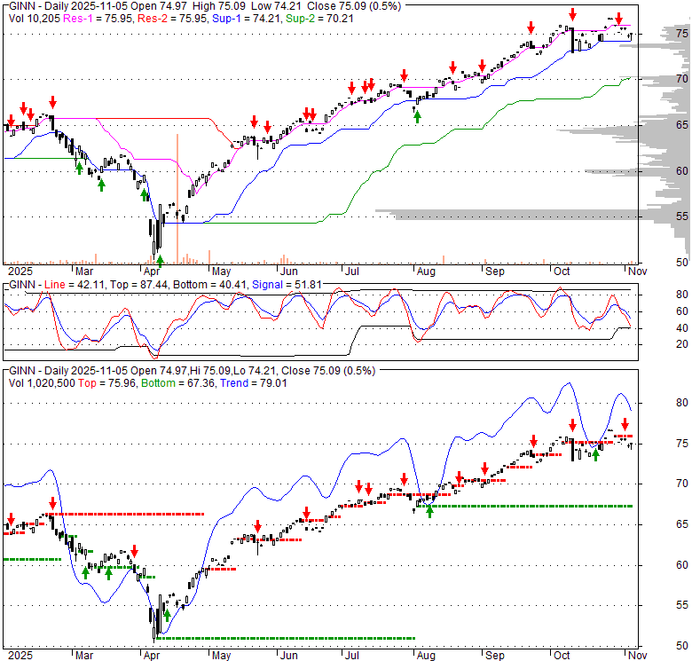 Price has closed below its short-term moving average. Short-term moving average is currently above mid-term; and above long-term moving average. From the relationship between price and moving averages: This stock is NEUTRAL in short-term; and BULLISH in mid-long term.[ GINN ] has closed above bottom band by 44.7%. Bollinger Bands are 3% narrower than normal. The current width of the bands does not suggest anything about the future direction or movement of prices.