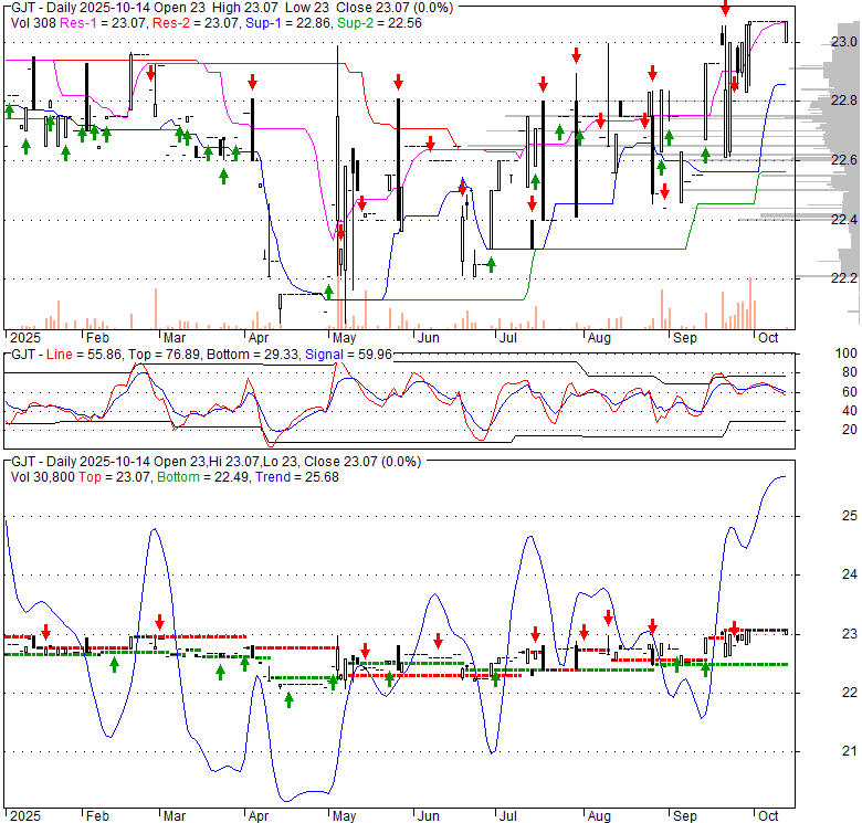 Price has closed below its short-term moving average. Short-term moving average is currently above mid-term; and above long-term moving average. From the relationship between price and moving averages: This stock is NEUTRAL in short-term; and BULLISH in mid-long term.[ GJT ] has closed above bottom band by 46.1%. Bollinger Bands are 38% narrower than normal. The current width of the bands does not suggest anything about the future direction or movement of prices.