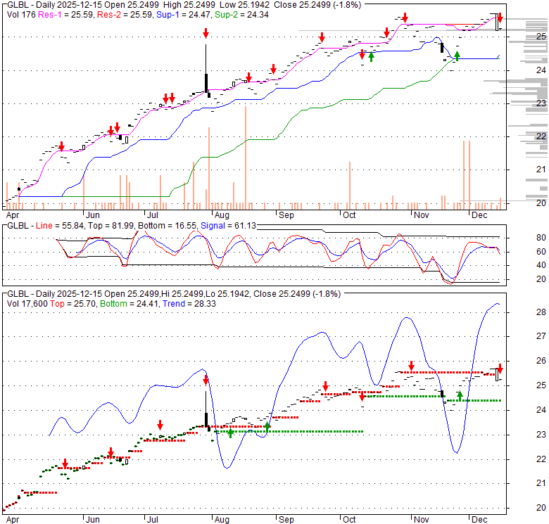 Price has closed below its short-term moving average. Short-term moving average is currently above mid-term; and above long-term moving average. From the relationship between price and moving averages: This stock is NEUTRAL in short-term; and BULLISH in mid-long term.[ GLBL ] has closed above bottom band by 39.5%. Bollinger Bands are 0.4% wider than normal. The current width of the bands does not suggest anything about the future direction or movement of prices.