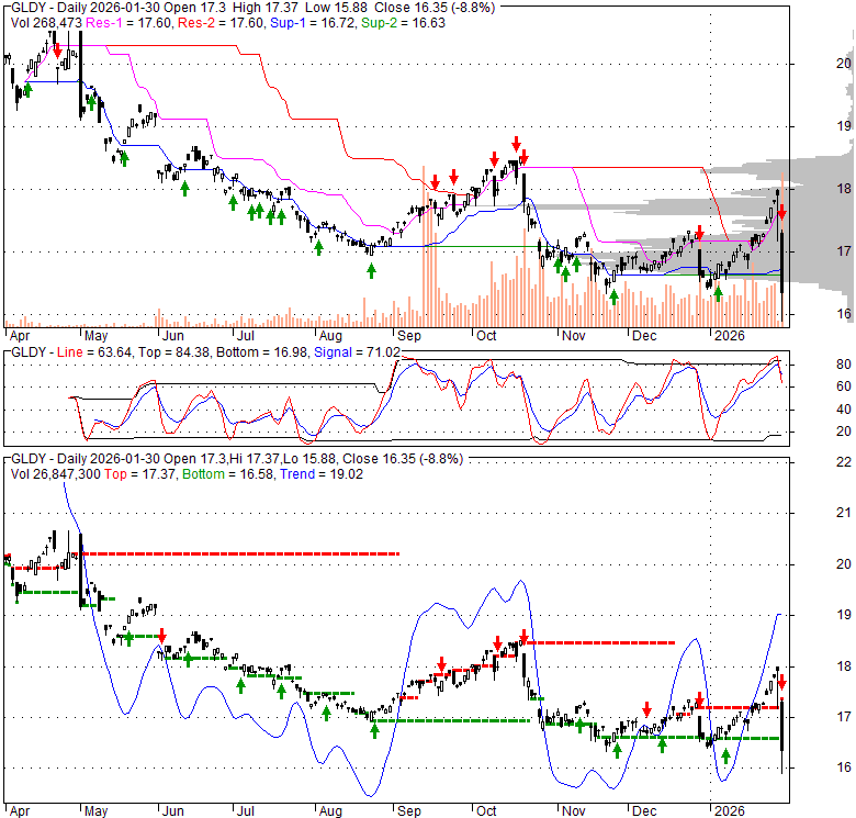 Price has closed below its short-term moving average. Short-term moving average is currently above mid-term; and above long-term moving average. From the relationship between price and moving averages: This stock is NEUTRAL in short-term; and NEUTRAL in mid-long term.[ GLDY ] has closed below the lower bollinger band by 1.7%. Bollinger Bands are 69.6% wider than normal. The large width of the bands suggest high volatility as compared to its normal range. The bands have been in this wide range for 1 days. This is a sign that the current trend might continue.