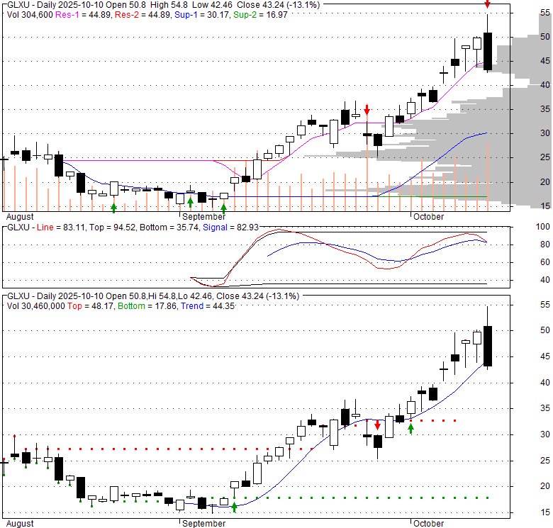 Price has closed below its short-term moving average. Short-term moving average is currently below mid-term; and below long-term moving average. From the relationship between price and moving averages: This stock is NEUTRAL in short-term; and NEUTRAL in mid-long term.[ GLXU ] has closed below upper band by 27.5%. Bollinger Bands are 0% narrower than normal.