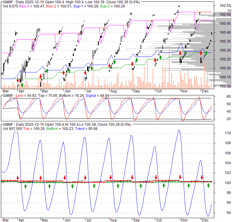 Price has closed above its short-term moving average. Short-term moving average is currently below mid-term; and below long-term moving average. From the relationship between price and moving averages: This stock is NEUTRAL in short-term; and NEUTRAL in mid-long term.[ GMMF ] has closed below upper band by 37.9%. Bollinger Bands are 4.6% wider than normal. The current width of the bands does not suggest anything about the future direction or movement of prices.
