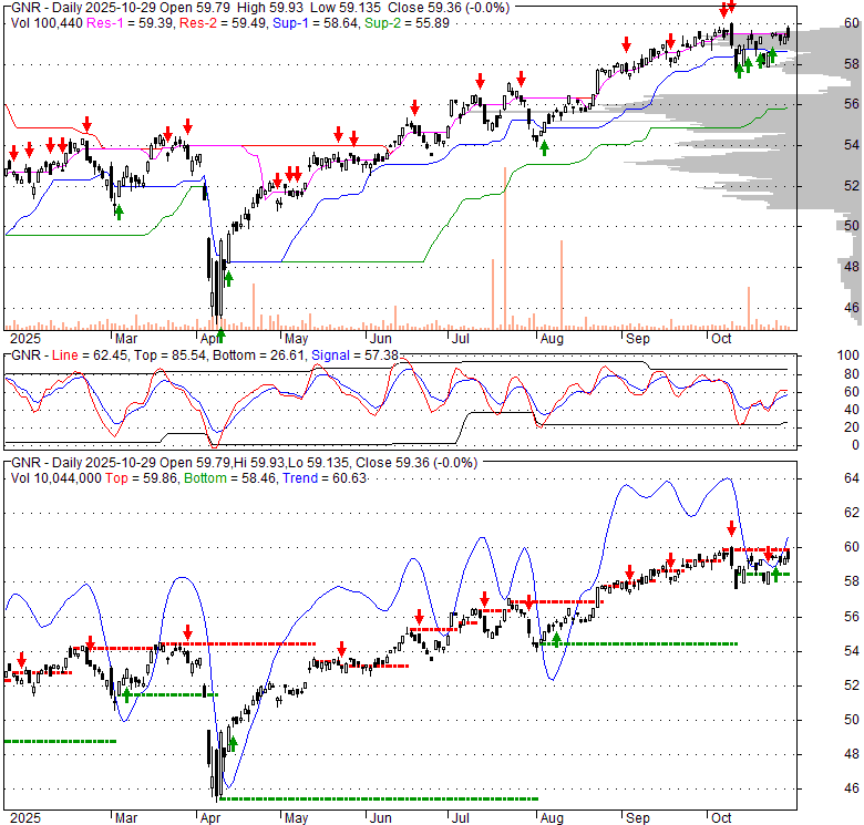 Price has closed below its short-term moving average. Short-term moving average is currently above mid-term; and above long-term moving average. From the relationship between price and moving averages: This stock is NEUTRAL in short-term; and BULLISH in mid-long term.[ GNR ] has closed below upper band by 43.4%. Bollinger Bands are 16.3% narrower than normal. The current width of the bands does not suggest anything about the future direction or movement of prices.